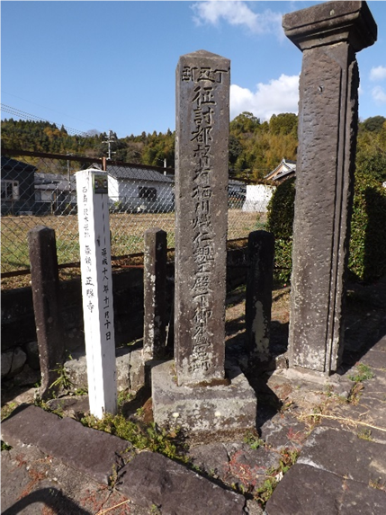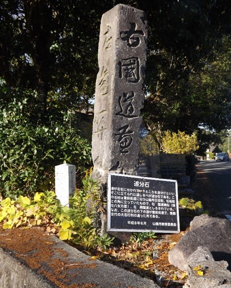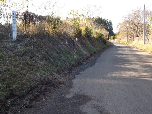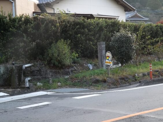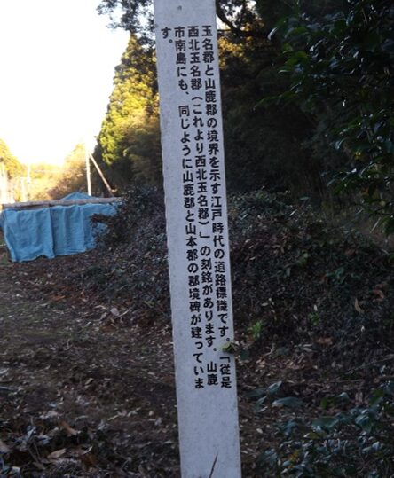 その先、左に 豊前街道郡境碑の標柱 「従是西北玉名郡」と刻む玉名・山鹿郡境碑が建つ。山鹿市に入る