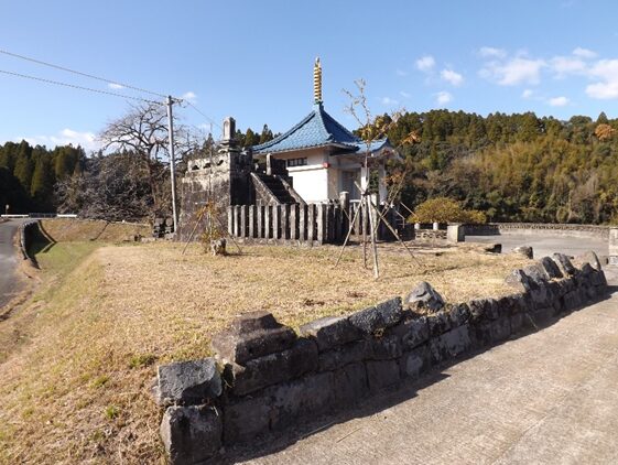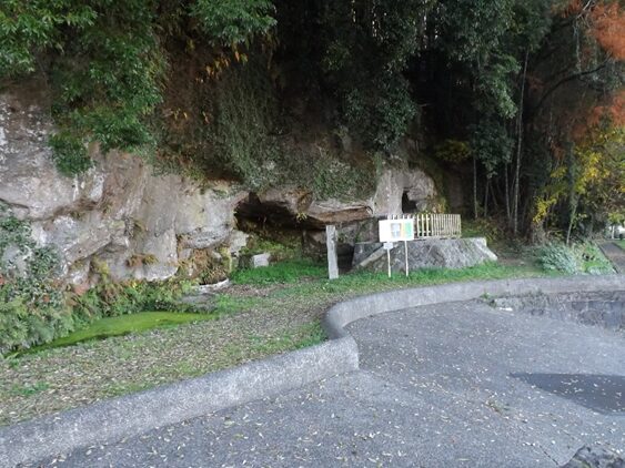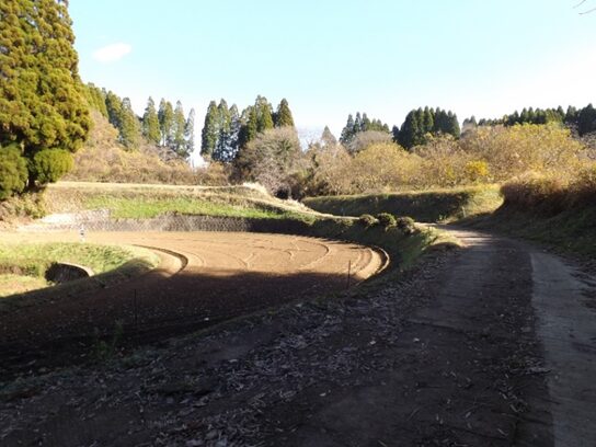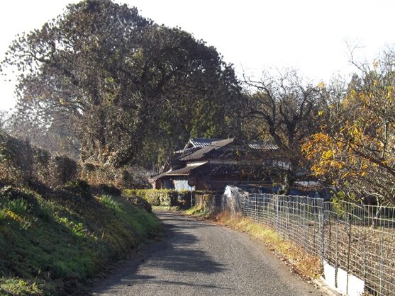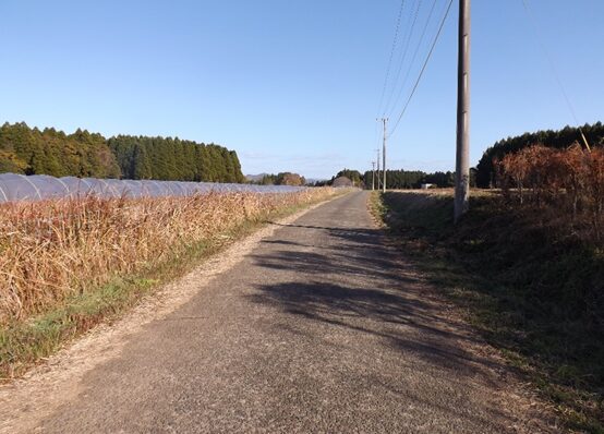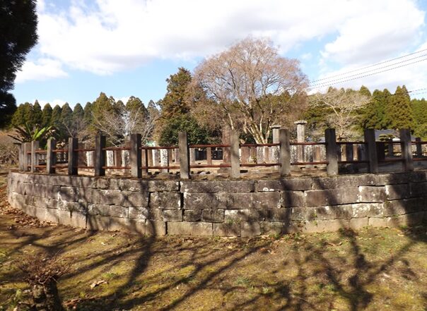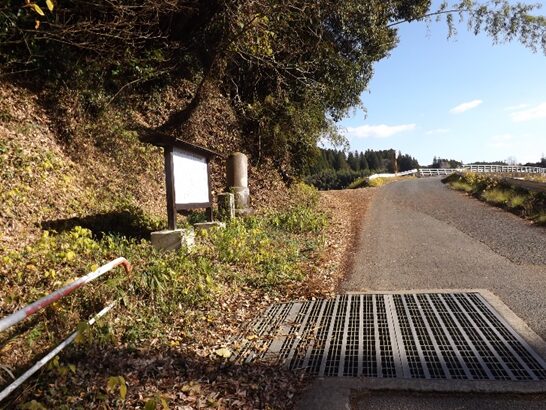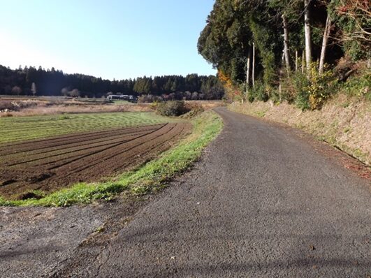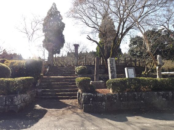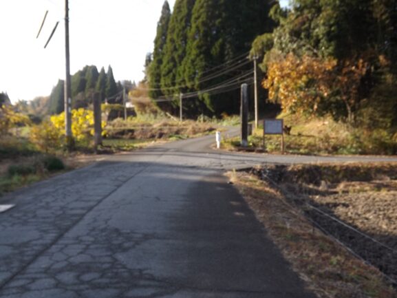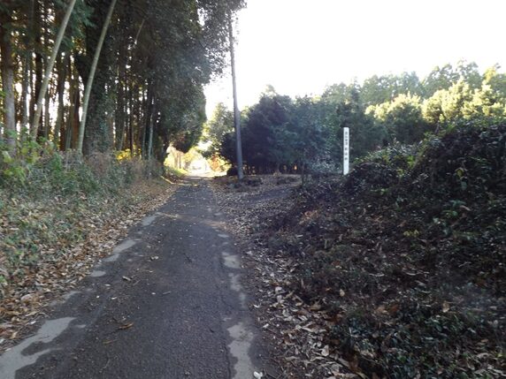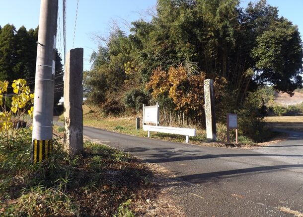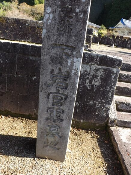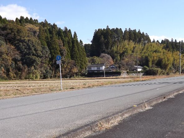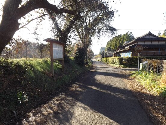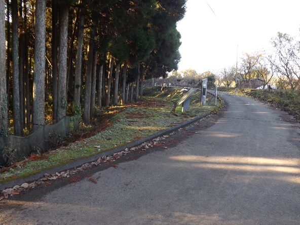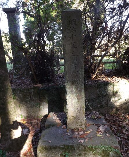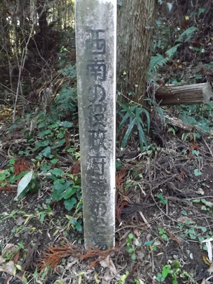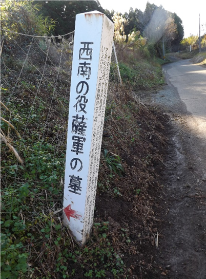 その先、右手に 西南の役薩軍の墓の標柱 畑の向こうの森の中に薩軍墓地あるというので行ってみたが、藪に覆われ道が無くなって分からない。冬でこうなのだから、行政も標柱があるのだから整備すればと西郷寄りの私にしたらる。何も官軍と薩軍に分けずに、ちゃんと整備してあげて欲しい