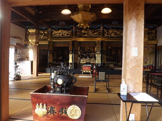 湯谷の集落内右の高台に 浄土真宗本願寺派轉法山明行寺 立派なお寺なので見学、若い住職さんで、京都の龍谷大学を出て修行され、ここに戻ってきて後を継いだとの事で爽やかな気さくな住職さんで、暫くお話をする。