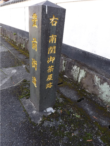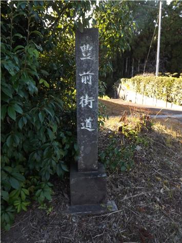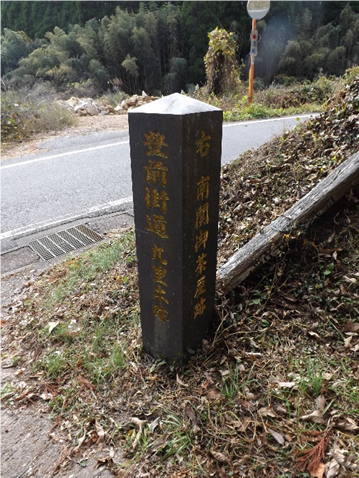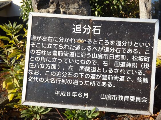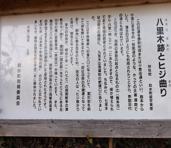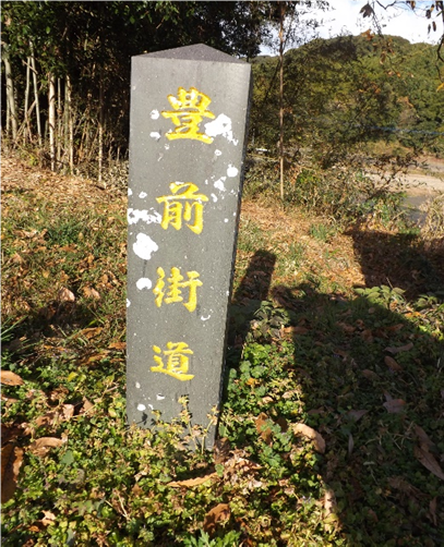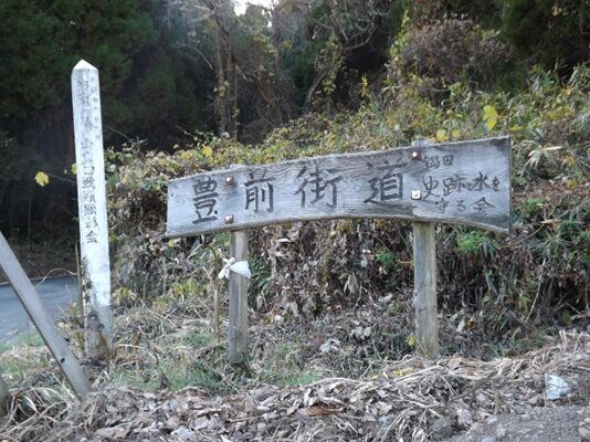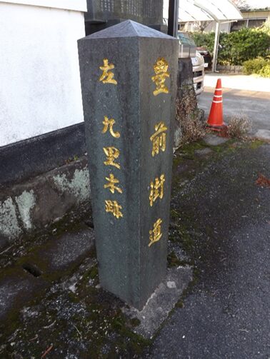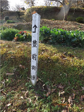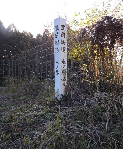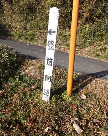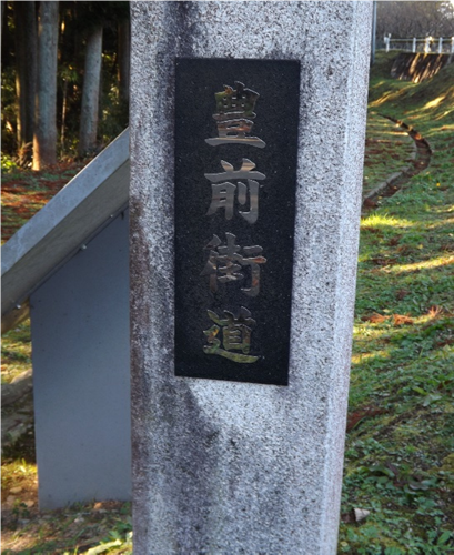 その先、左に 豊前街道の標柱 側面には参勤交代と西南戦争の記述がある