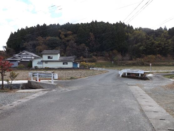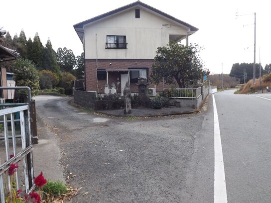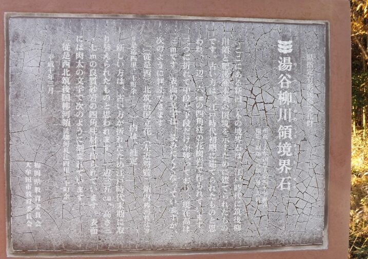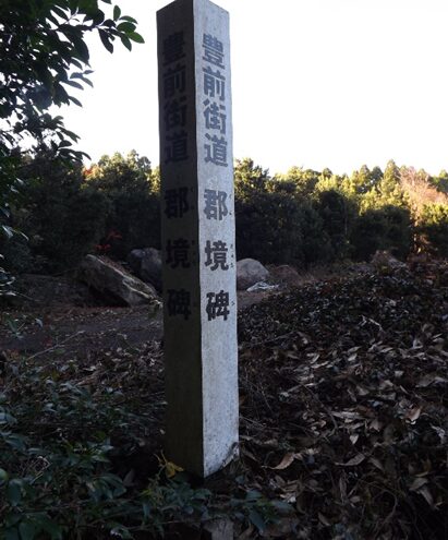 真直ぐ進んだ先左T字路の地点に 境界石二基 が旧道を挟んで立っている向かって左が古く、右が新しい。江戸時代の筑後柳川領と肥後熊本領の国境を示す。分岐は左の道