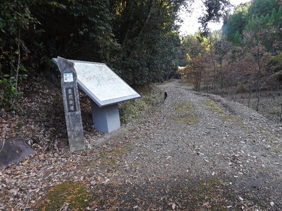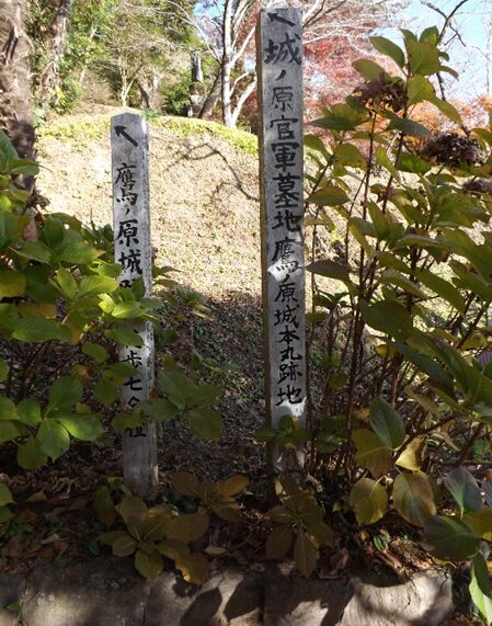 上り口に建つ、鷹ノ原城跡・城ノ原官軍墓地鷹ノ原城本丸跡地への案内標柱