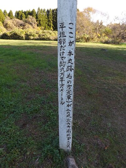 この地が、本丸跡右の方(北東)が二の丸左の方(南西)が三の丸。平坦部だけで約九万平方メートル