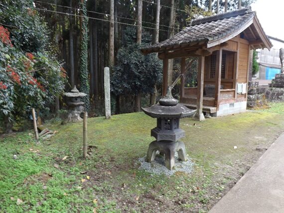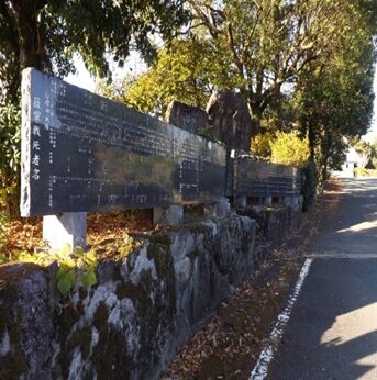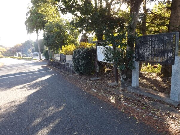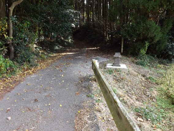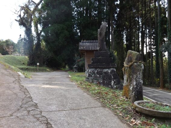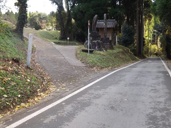 十字路に出ます右手に 平和之碑 左手に 西南の役戦没者慰霊碑やその記録の石碑 また追分石があり、山鹿市日吉町、松坂町との角に立っていたのをこの地に移転。「右国道兼松道」「左南関道」と刻まれている。左古代の森