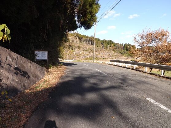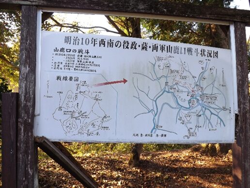 西南の役、山鹿口の戦い跡の説明板、この先二つ分岐があるが、左の真直ぐな道を進む