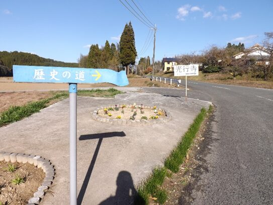 分岐の手前左に歴史の道、光行寺の案内標示が立つ