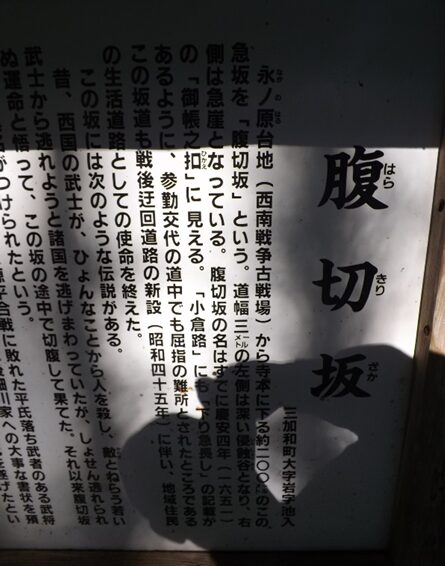 腹切坂は永ノ原台地から寺本に至る200mの急坂で慶安4年(1651)御帳之控にその名が出てきている。