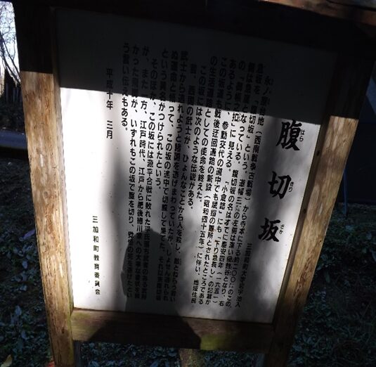 西国の武士が人を殺し、仇と狙う若い武士から逃れようと諸国を逃げ回ったが、逃げられぬと観念、この坂で腹を切ったという。
