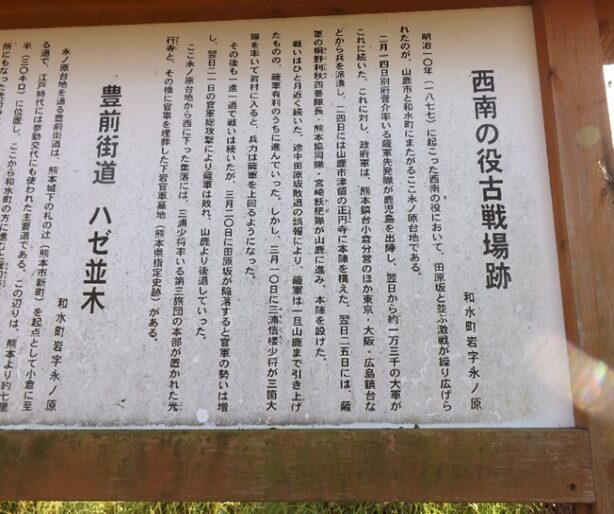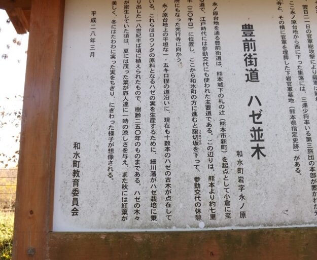 その先、右手に 西南の役古戦場跡の案内板と ハゼ並木の案内板 当時、蝋の需要にこたえるため細川藩がハゼからの蝋を作り出し、18世紀後半に植えた、現在も10数本樹齢250年のハゼが残っている