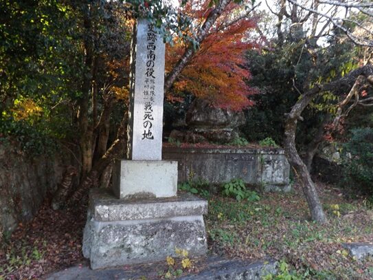 国道沿い右手に 史跡西南の役熊本協同隊隊長平川惟一戦死の地碑
