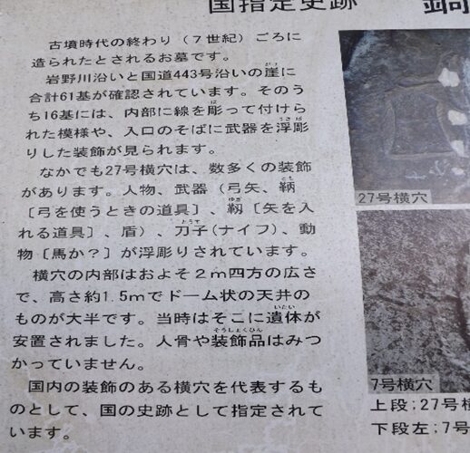十字路に戻ると、チブサン古墳の石人を4倍に拡大したモニュメントと古墳の案内板がある。特養チブサン荘の前を抜け坂を下る。左にカーブすると、道路改修記念碑・豊前街道の標柱、岩野川の手前左に、豊前街道の標柱と国指定史跡鍋田横穴古墳がある。ここで443号に合流して、岩野川に架かる鍋田橋を渡る。