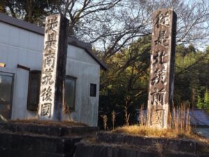 その先、右手に 西南の役薩軍の墓の標柱 畑の向こうの森の中に薩軍墓地あるというので行ってみたが、藪に覆われ道が無くなって分からない。冬でこうなのだから、行政も標柱があるのだから整備すればと西郷寄りの私にしたらる。何も官軍と薩軍に分けずに、ちゃんと整備してあげて欲しい