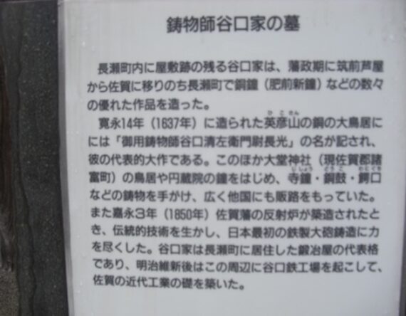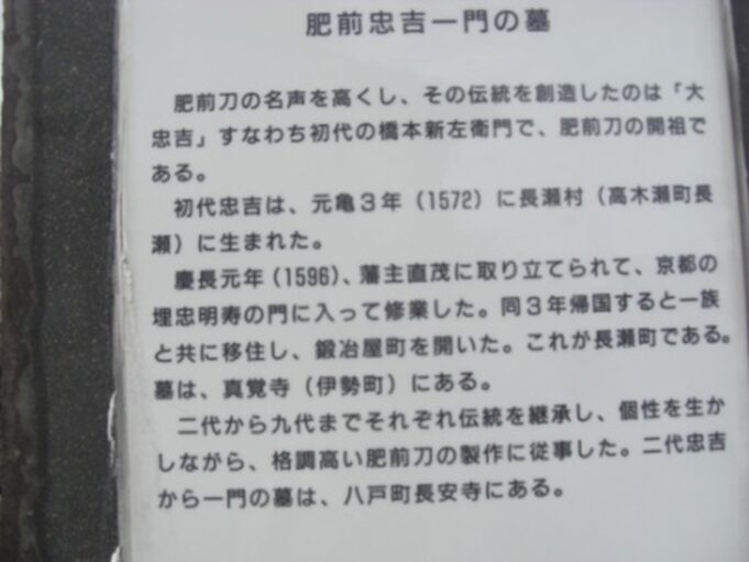 門前に碑 刀匠初代 肥前国忠吉公之墓 初代忠吉は元亀三年(1572)生まれ、修行の末佐賀城下長瀬に居を構え、佐賀藩の抱刀工となった。日本の刀剣史上、肥前忠吉の名は極めて価値の高い人物