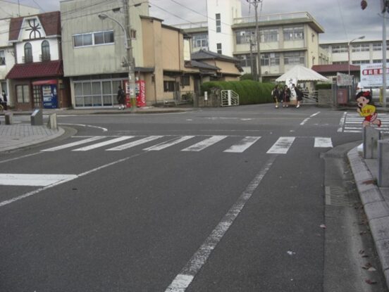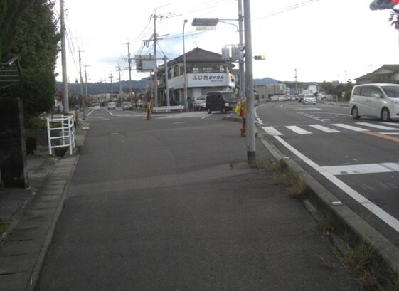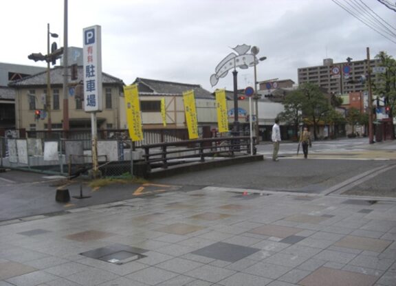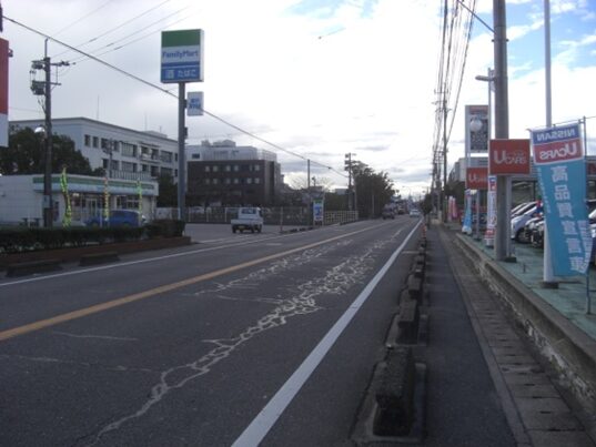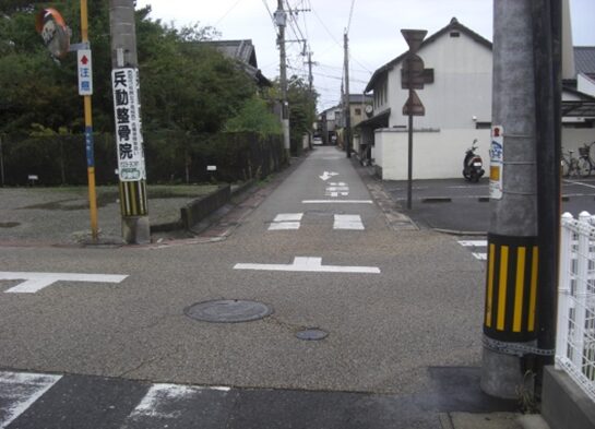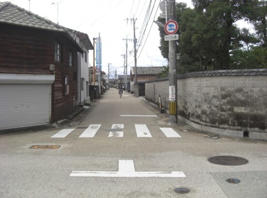 武家屋敷門を左奥に見て、西への街道を進みます。左に素心庵栗山医院、少し先右にインターナショナル歯科クリニックがあります。その先で南北の紡績通りの交差点にでます、左角に井手塗料店があります、その交差点から街道は広くなり西へ。 数十m進むと南北に通る国道264号線の多布施一南信号交差点にでます