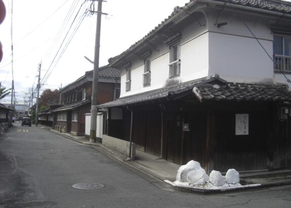 右に 枝梅酒造があります。この辺りの街道は、一軒一軒斜めに構えた家並みで、のこぎり型家並み と呼ばれています。