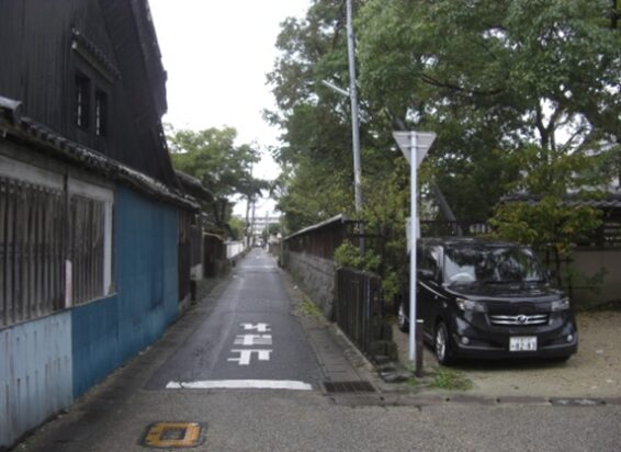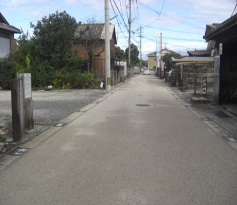 左に牛津高校校門が見えた角を右に折れる。折れたところから振り返ったところ。校門の辺りに 高札場 がありました、この先少し長い目の鍵の手になっています