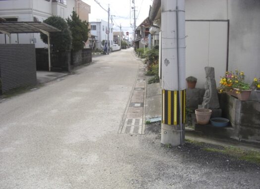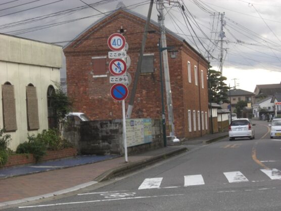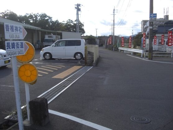 一番左の西への旧道、左角に長崎街道の案内表示