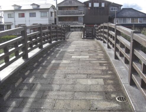 本庄川に架かる 高橋(復元)を渡ります。八戸町の西の端、旧深町井樋に掛けられていた橋が高橋で、慶長年間に架けられたと伝わる。旧高橋から東へ街道沿いに、高橋宿、鉤の手に折れ曲り、八戸宿に繋がる。この鉤の手のところに番所が設置されていた