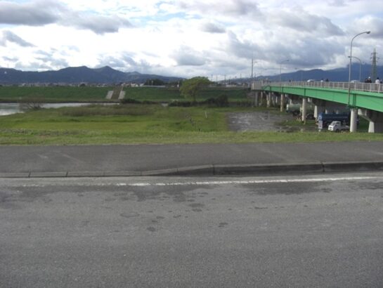 突当りの堤防から、かつてこの辺りをわたっていました。右が嘉瀬川に架かる嘉瀬橋