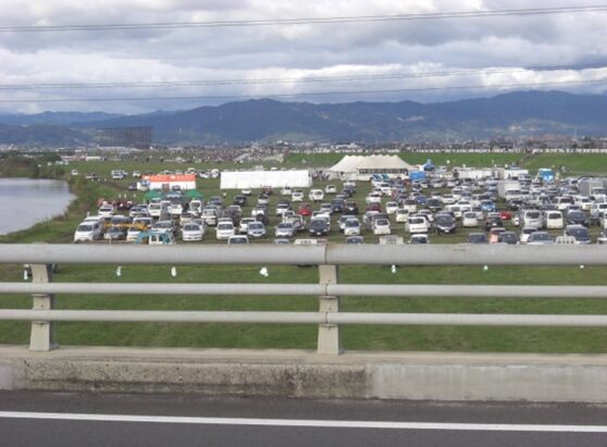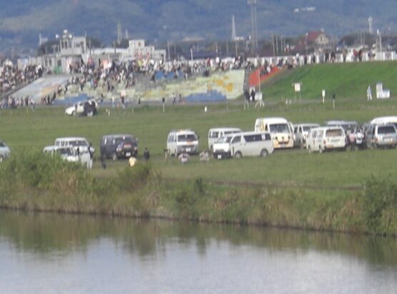 毎年10月下旬~11月上旬の1週間この河川敷で行われているそうで、1978年から福岡で始まり、1980年から佐賀に会場を移し、毎年十数ヶ国から選手が集まり、110機前後の気球が集まるそうです。競技はどのようにするのか分かりませんが、偶然に巡り合ったが、残念ながら今日は悪天候で条件が悪かったようで飛んでいません。でもたくさんの車や見学の人が集まっています