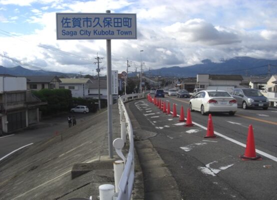 嘉瀬橋を渡り佐賀市久保田町に入ります左下に見える道が、東側からの旧道の延長の道です。少し先で右の国道に合流しています