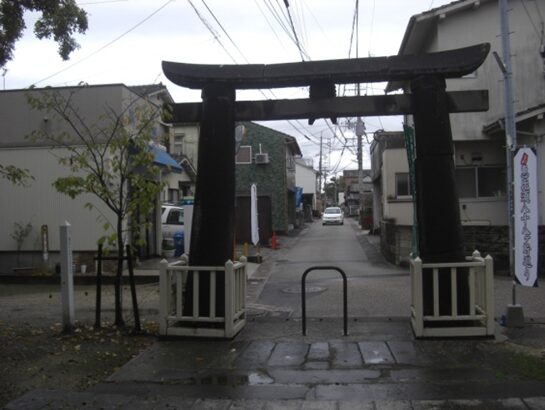 右に折れて170m程 本陣跡 を見て進むと正面に鳥居が見えます、その前のT字路を街道は左に折れます