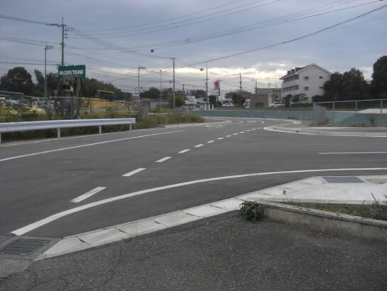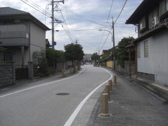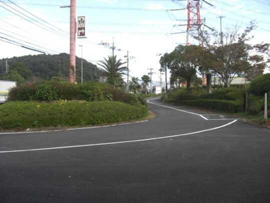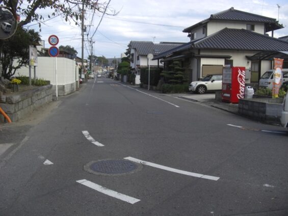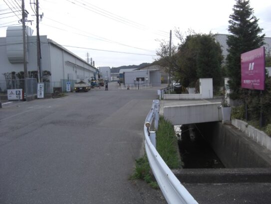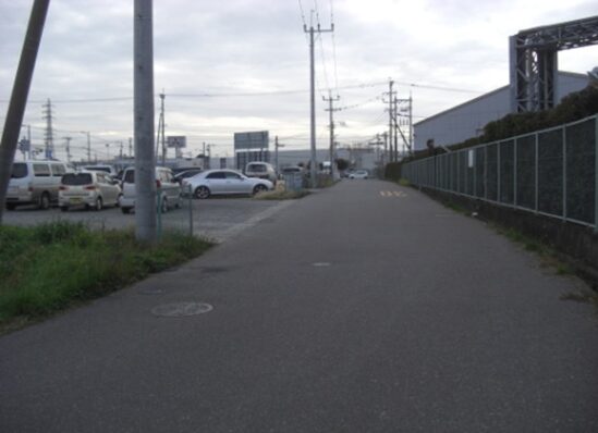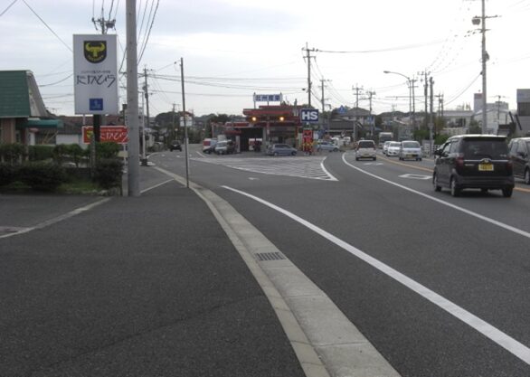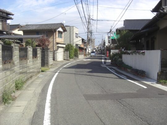 西側を見たこの先の眺め、競馬場前バス停の先、右にパナソニックの工場、左にGSが見えるところを左に入ります