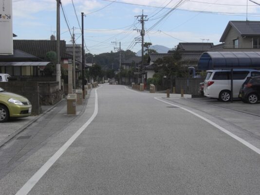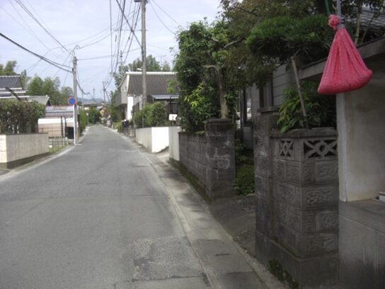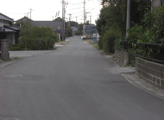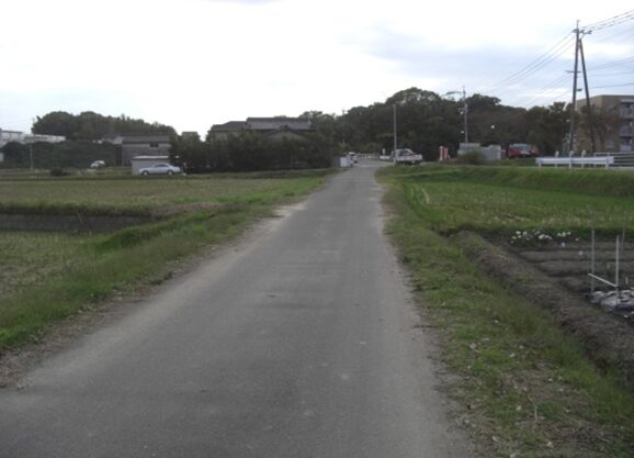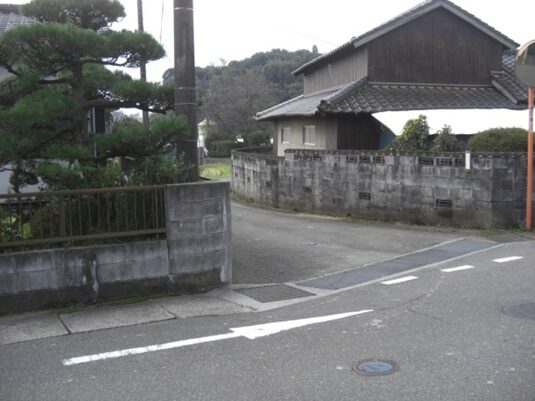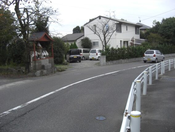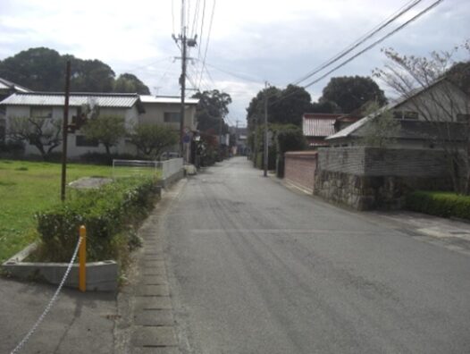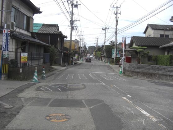 さらに原田駅入口交差点から先の旧道は、新しい道路や住宅地に変わり消失しているようです。止む無く信号交差点から車道を進みます。左にマルキョウ、右におだ歯科医院を見て、駅前バス停を過ぎると左に緩やかにカーブしています。原田駅入口交差点から150m程です。かつての消失した旧道はこの辺り、右にダイソーを斜めに横切り原田6の住宅地を西に200m程進み、原田5でJR鹿児島本線を高架道路橋で渡る踏切に出ていたようです。その先改修された新道を左に緩やかにカーブを描き200m程進みます、新道の左に沿って旧道らしき道があります。少し複雑な辻に出て、街道は左(南)への細い道を進みます。