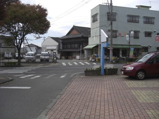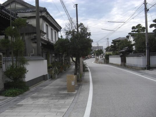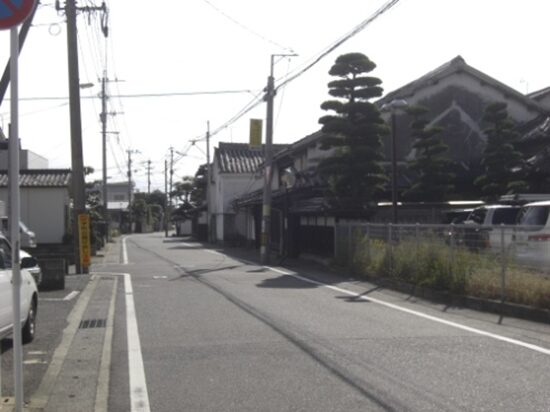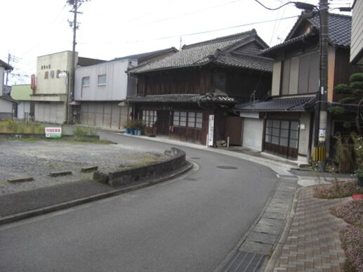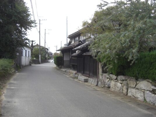 右に折れた先、新町の街並み新町は大工・鍛冶屋などの職人町でした。新町宿の西にこんもりとした朝日山(標高132.9m)山城跡が見えます