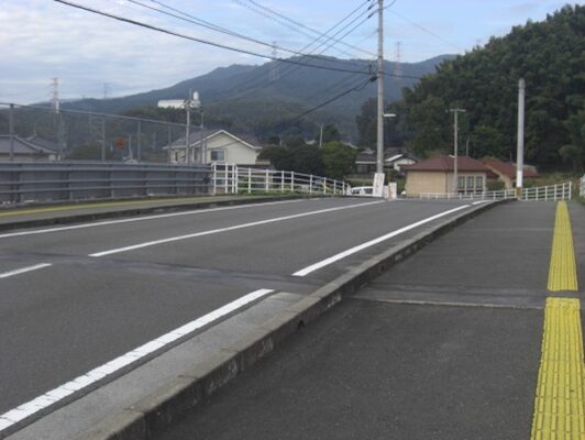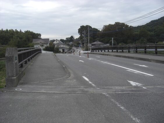 轟木宿を出てから1㎞程の安良川を渡ったあたりです。右手に朝日山を見ながら安良公民館の前を通っていきます