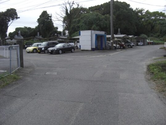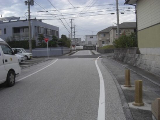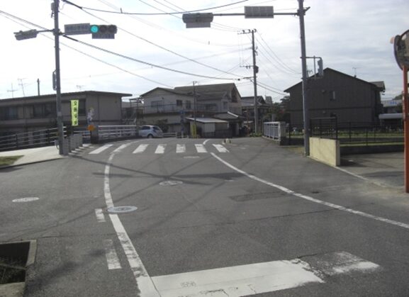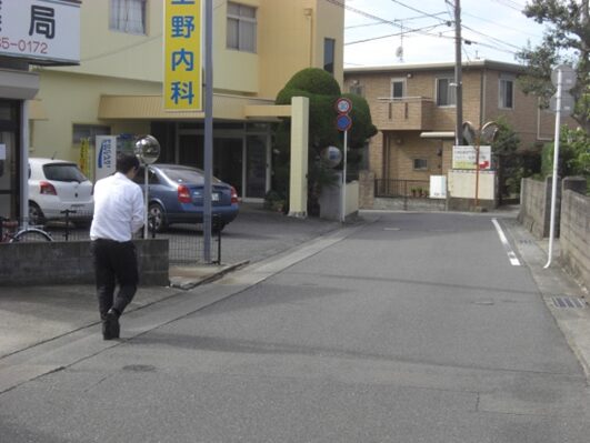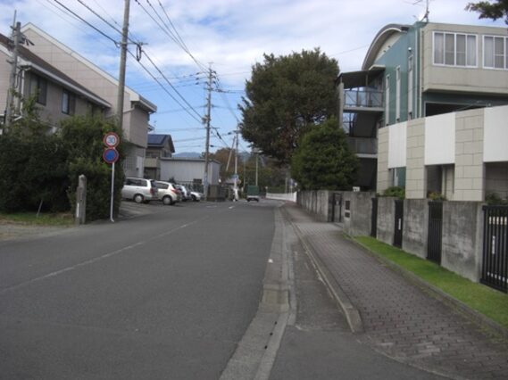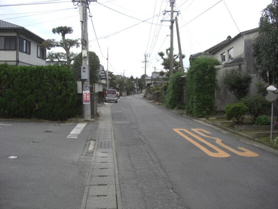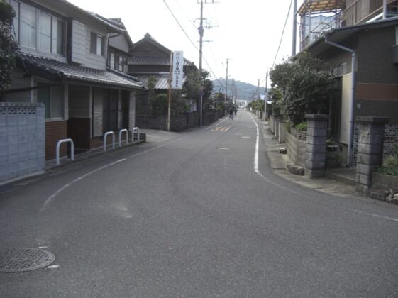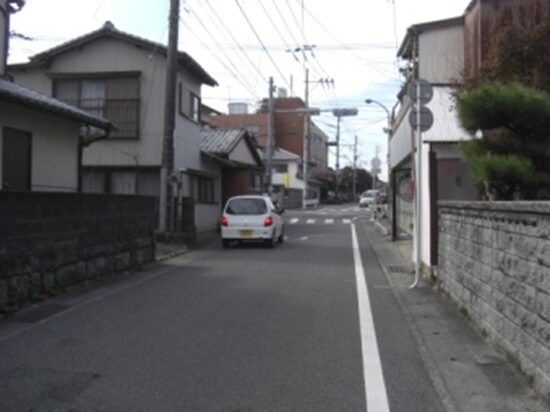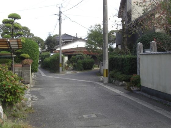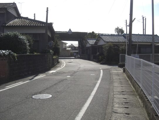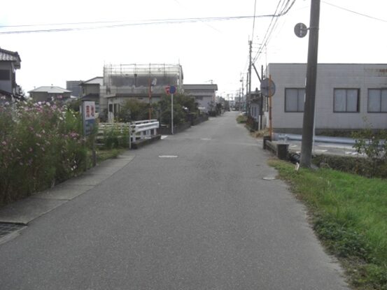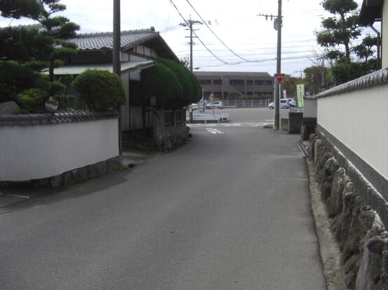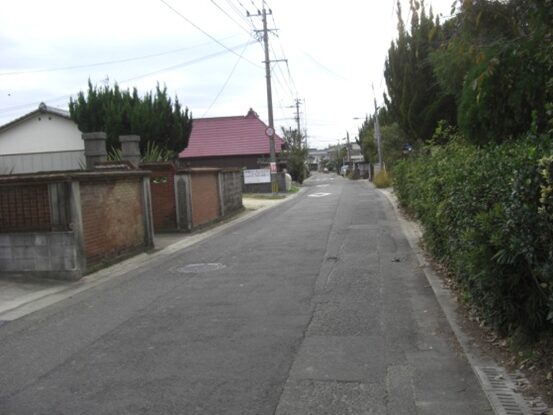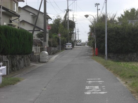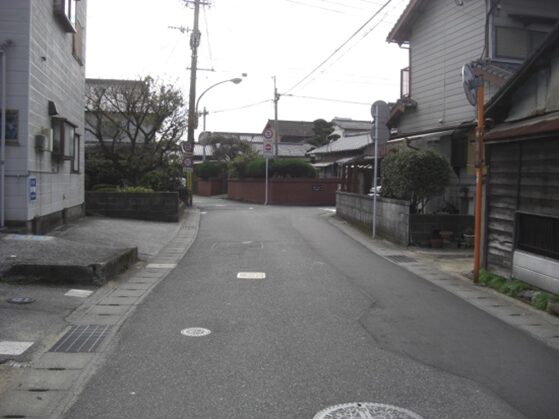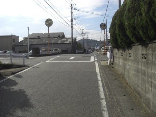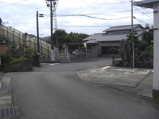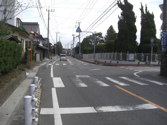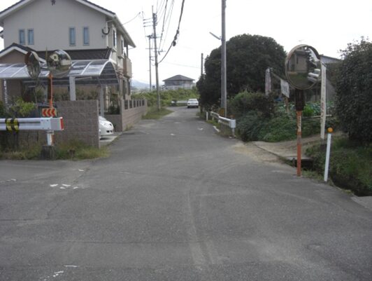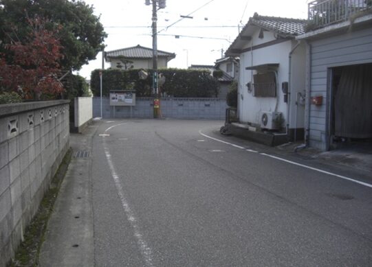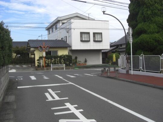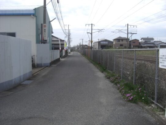 右に折れて数十m線路の側道を進むところ正面突当りを左に折れます