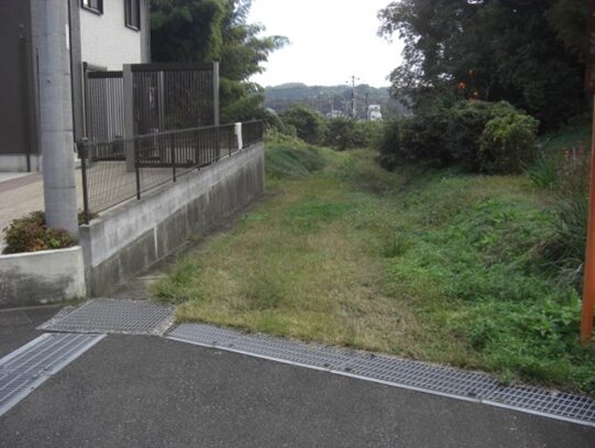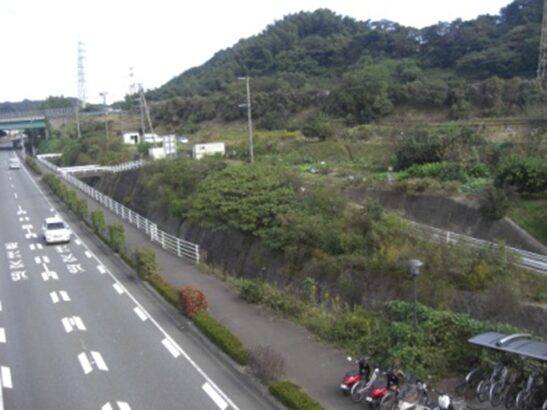 けやき台駅の3号線を跨いでいる連絡橋から歩いてきた道の右斜めを見る。関屋川とその右手前方向辺りがかつての旧道が通っていた三国国境の三国坂付近振り返ったところ