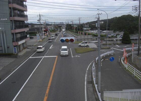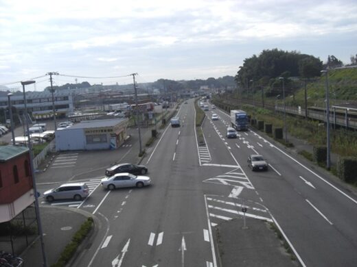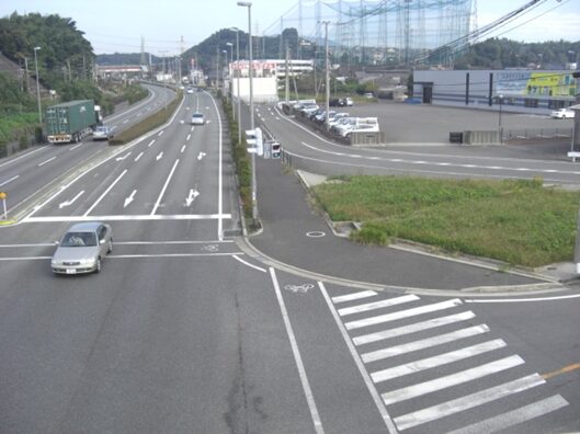 やがて佐賀競馬場前信号交差点に出ます。すぐ先に歩道橋が架かっています。歩道橋の上から国道34号線の今歩いてきた東を見た眺め