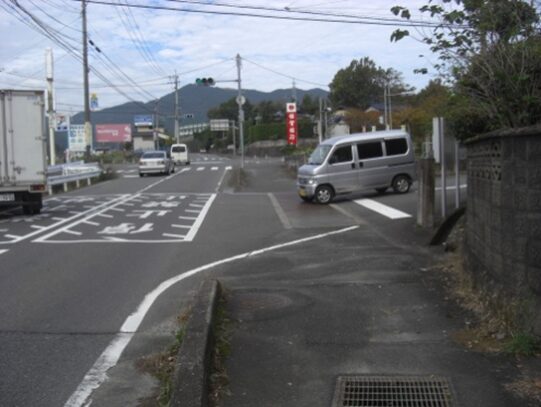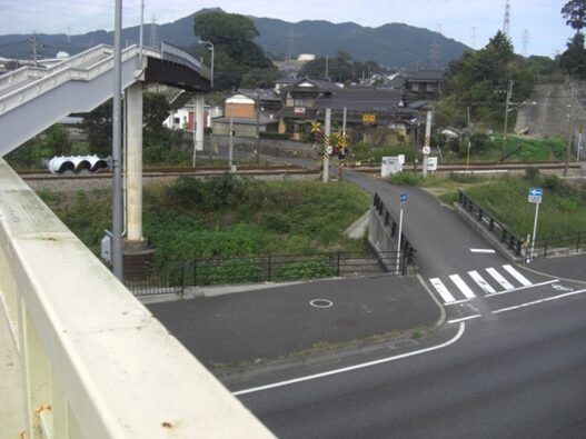 旧道が消失しているので、私は前述の駅前バス停の南の十字路から100m程進み、左に自動車販売はるだがある左T字路を右に折れて、200m程進んだ原田5のJR鹿児島線の高架道路に出ました。高架道路の東詰辺りに消失した旧道が通ってきていました