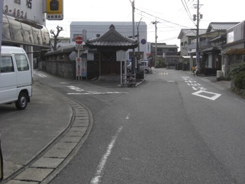 中町で左に、いとうクリニックがある先の十字路を越すと下町に入り少し進んだ突当り鉤形の辻を右に折れます