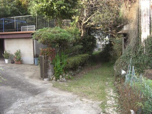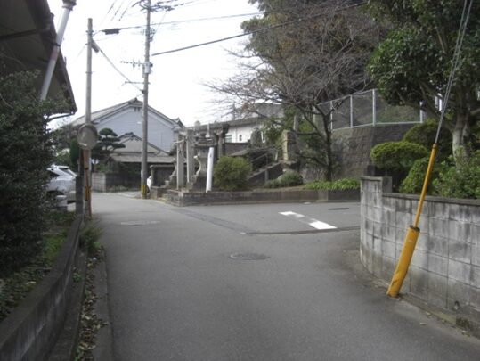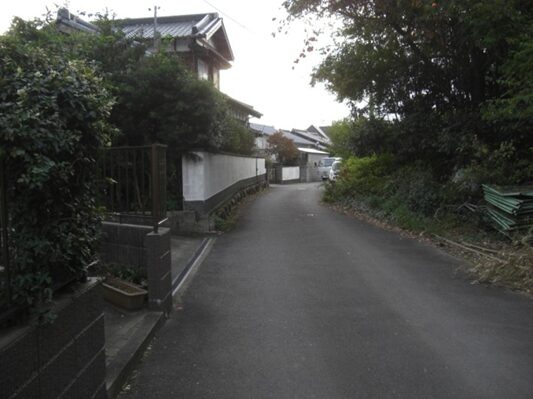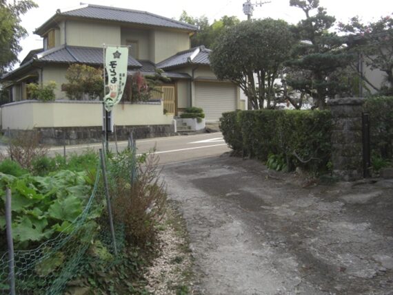 左に折れて少し進んだ先から振りかえり、日子神社を見る。この右辺り奥に入っていくと御茶屋があった