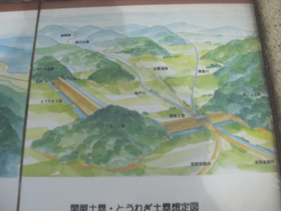 関屋土塁は、663年に日本の百済救援軍が唐・新羅の軍に敗北した白村江の戦いの後、665年に築かれた基山山頂近くに築かれた基肄城(きいじょう)古代の山城の関連施設と伝わり。西側の千塔山丘陵と向平原丘陵間の「とうれぎ土塁」を経て基肄城への防衛ラインで、大宰府の守りを目的として築かれた。現在は、道路・線路・住宅等により破壊が進み殆んど残っていない
