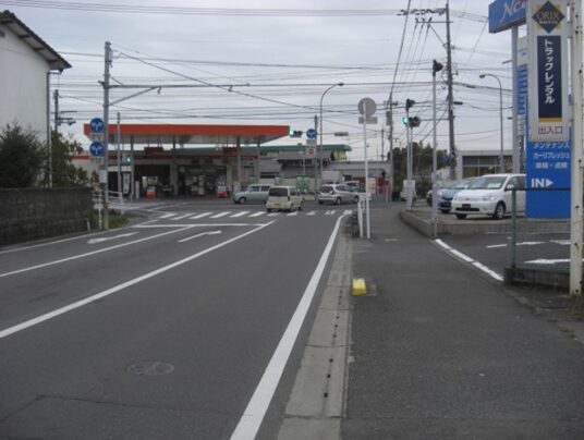緩やかな坂を下っていきます正面角にGS、北茂安町白石信号交差点 分岐は左の道