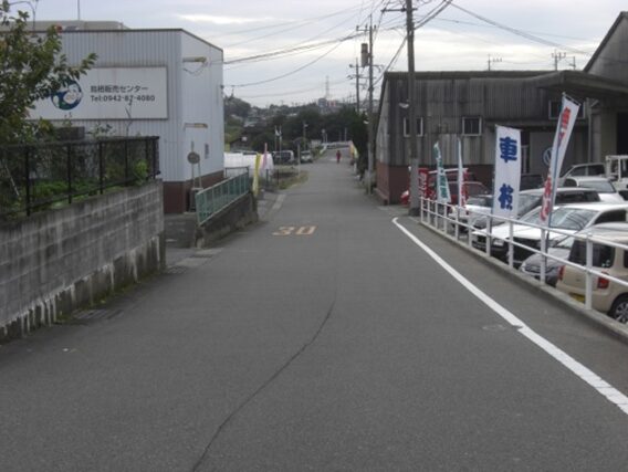 450m程進むと再び右からの34号線に合流します。合流後、国道を白石東・みやき町白石の信号交差点を越えて、すぐ左のビーエス物流センターを見て進むと、道は分岐しますので左の旧道に入ります