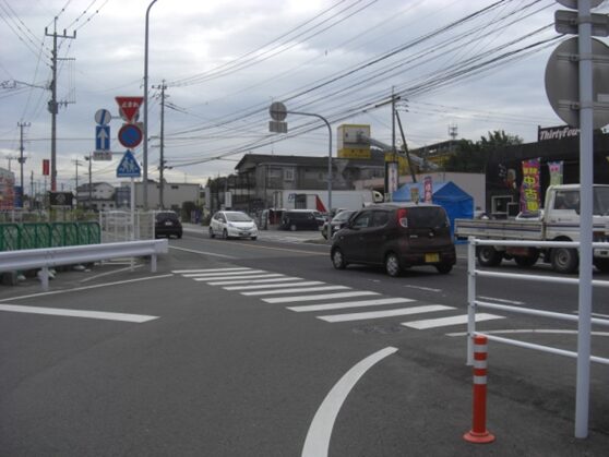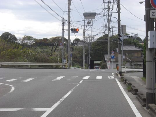 高架道路の下から130m程で左からの筑紫野バイパス南信号交差点に出ます。広い道路です