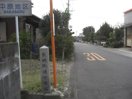 福岡藩内の長崎街道は筑前六宿街道(黒崎~原田:十四里十六丁・約五十八㎞)とも呼ばれ、その六宿の一つ原田宿は、筑後・肥前と接する国境の宿場です。宿の形成は隣の山家宿が慶長十六年(1611)頃なので、ほぼ同時期と考えられています。原田宿の東構口・西構口は取り壊され遺構は全く残っていません