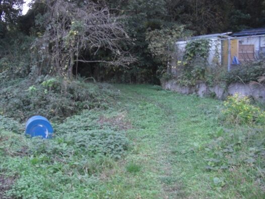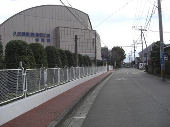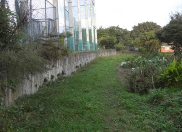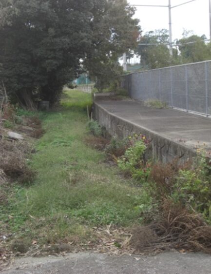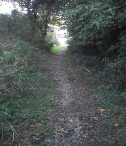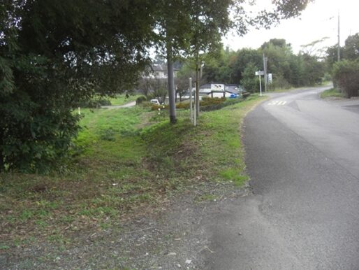 真っ直ぐの旧道(結果的に旧道)を入り右に弓なりにカーブしながら100m進むと分岐があり右の道を進むと、更に100m程右にカーブしながら進むと、左は集落内からけやき台駅の方向に進む道で、右はやや深い草地になっていますが旧道跡の様です。草地を100m程進むとまさしく前述のJR線・3号線のすぐ先東側にスクールが見えます。旧道跡と確信、この瞬間がたまらなく嬉しい、その先の旧道は消失してます
