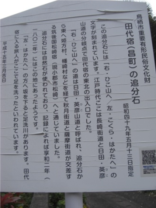 ここの辻はかつての追分で、鳥居から見て左(東)長崎街道で山家へ、右(西北)は大宰府天満宮への参詣道で博多街道とも呼ばれた。追分にあった道標は道路整備により別途保管されているそうです。