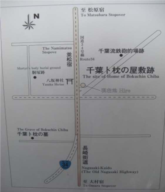 長崎街道の並松宿と地域の開発に貢献した千葉卜枕の屋敷跡。この辺り一帯は未開拓な放虎原という原野であった。開拓の後、原野に町が誕生、大村藩はこの新しい町を「並松の宿桜町」と称し、