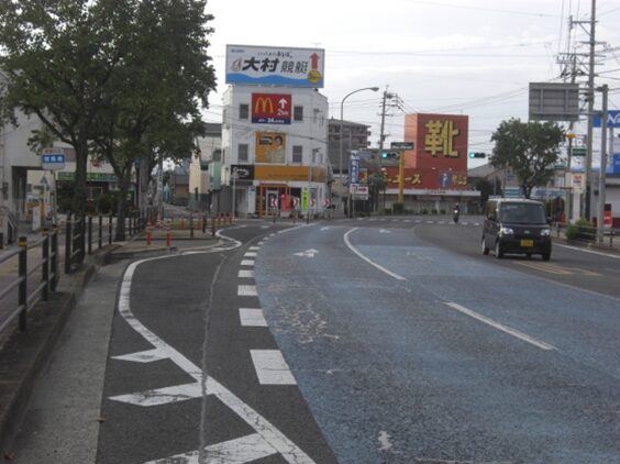 桜馬場信号交差点を越えていくと西大村本町信号交差点に出ます、国道はやや右にカーブするが、街道は左側真っ直ぐの細い方の道になります。分岐する正面角に黒川精肉店があります