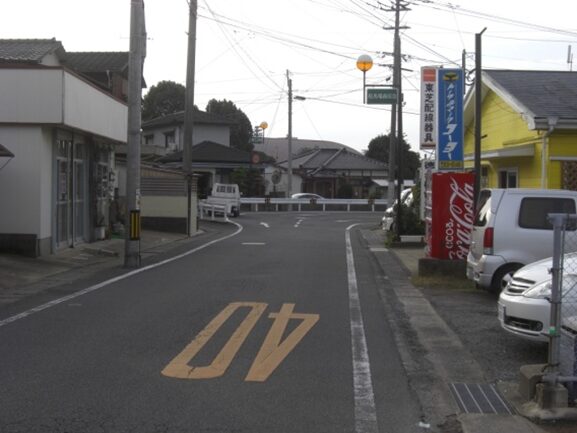 下大渡野町の破籠井バス停の手前、南への道を振り返る。向かって右(東)への道は34号線に出ます。手前に進みます