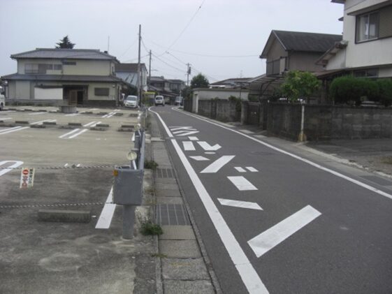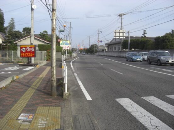 横断する道路の右を見たところですここで少し【寄り道】で街道よりはずれます。この道を250m程西に進み二つ目の信号、国道の協和町信号交差点に出て、左(南)に折れて国道を150m程進み杭出津3信号交差点手前を左方向に入ったところに行きますと