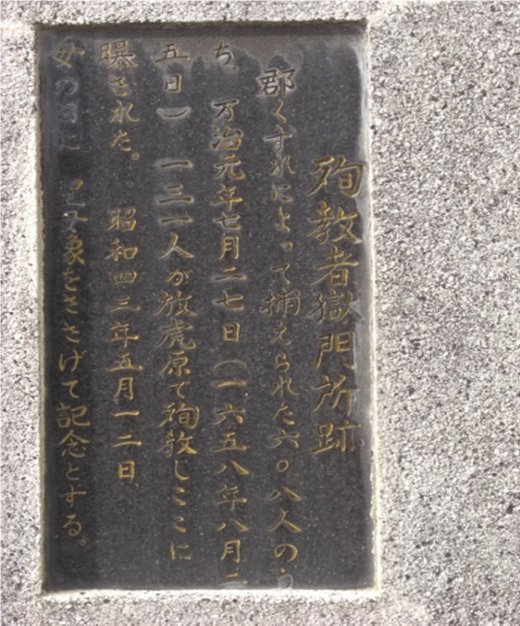 キリスト教殉教者;獄門所跡 放虎原で処刑された131名の首は、塩漬けにされ、獄門所で20日間晒し首に見せしめにされました。前の道は長崎街道です