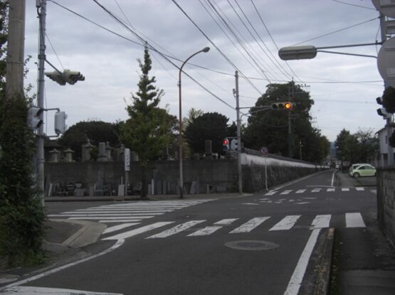 T字路の追分石(北角)をみて南西に200m程進むと、五差路の信号交差点に出ますので、左(南東)に折れます。その左角ミラーの袂にも