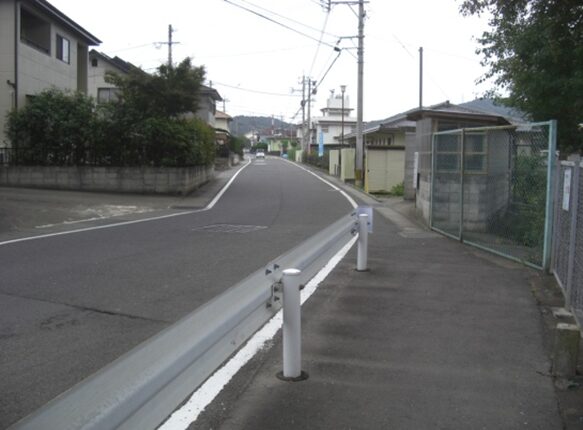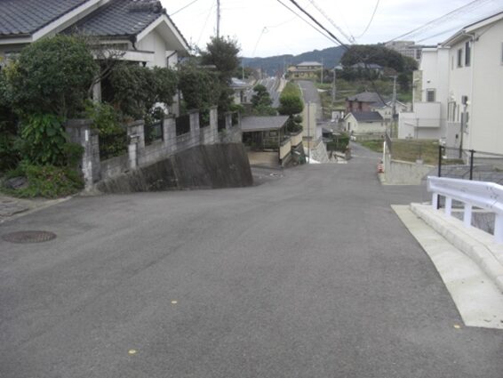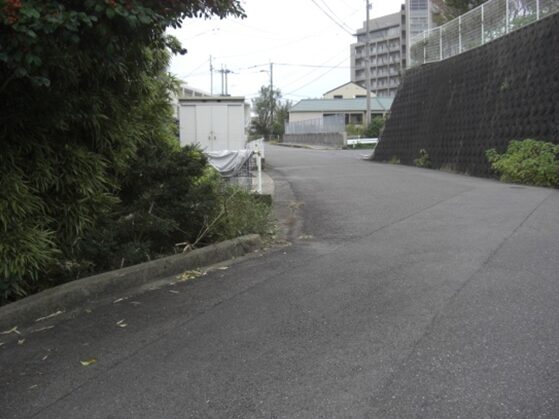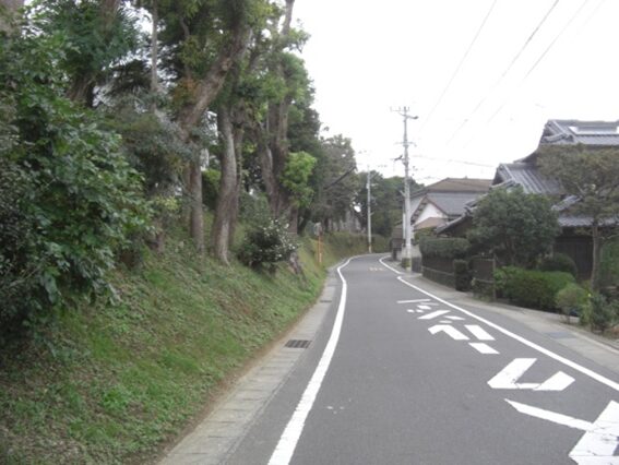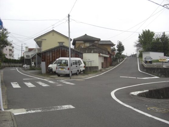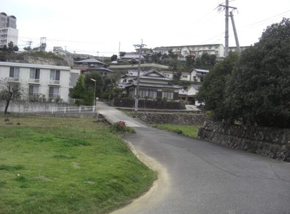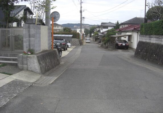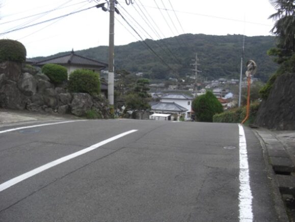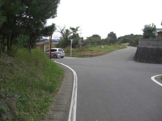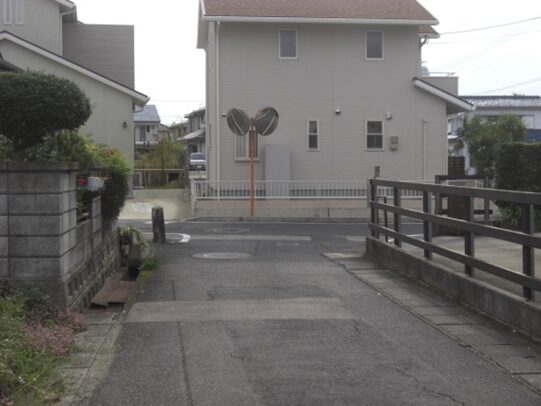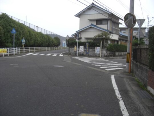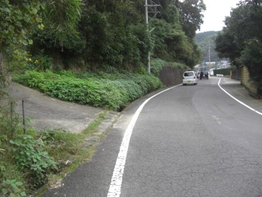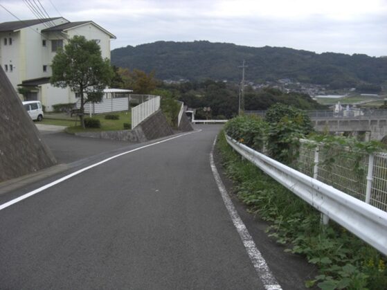 鎮西学院幼稚園の切れたところで、道は分岐しますので右の旧道を進みます。分岐を振り返ったところです